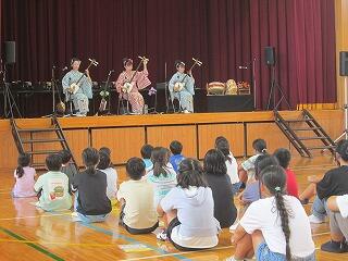 夏尾中で「学校と地域を結ぶコンサート」が開かれ、小学校の子どもたちも参加しました。村上三絃道のみなさんが、津軽三味線で民謡や地域の唄など、90分にわたって演奏してくださいました。コンサート中には、三線や津軽三味線などの違いの説明や子どもたちが参加する場面もありました。舞台に上がって一緒に演奏する機会もあり、「初めて三味線に触った」「楽しかった」などの感想を話していました。地域の方を含めて110人の方が大変盛り上がったコンサートを楽しみました。9月20日付宮日新聞にも記事か掲載されました。村上三絃道の皆様、スタッフ、関係者の皆様、ありがとうございました。