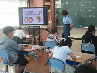 今日は5・6年生に向けて、非行防止教室がありました。警察の方に来ていたいただき、パソコンやスマホなどによる個人情報の流失やそれに伴う被害の広がりについて学習しました。子どもたちは、ゲームなどで見知らぬ人とつながる可能性があり、そのようなときにどんなことに注意をすればよいのか、自分のこととして考えていました。