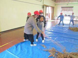 4校時に避難訓練を行いました。体育館の方から入ってきた不審者が子どもたちのいる2階に向かいます。