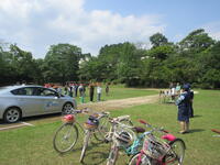 2日目は、朝のつどいの後、青島までサイクリングをしました。心地よい海風を受けてサイクリングした後、宮司さんからお話を聞きました。