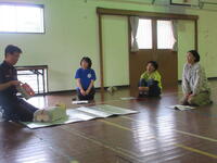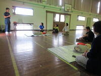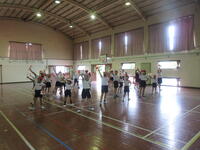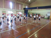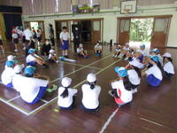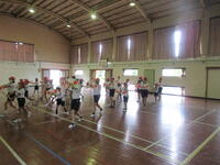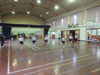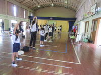 台風10号接近に伴う雨の影響により、中学校の体育館での練習となりました。