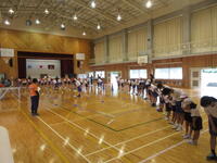 体育館での全校集会。バトミントンクラブの子ども達の活躍も紹介されました。