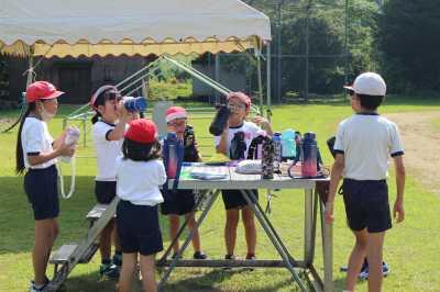 まず、先生に野鳥の種類、すみか、観察の仕方、注意点などを教えてもらい、早速校庭へ出ました。ここにもツバメやすずめがいましたが、先生から「他の鳴き声も聞こえるよ」といわれて、一生懸命、双眼鏡をのぞいていました。双眼鏡の中で野鳥を捕らえることは難しかったのですが、野鳥の見つけ方や人の動きなど、野鳥観察の第一歩を教えていただきました。