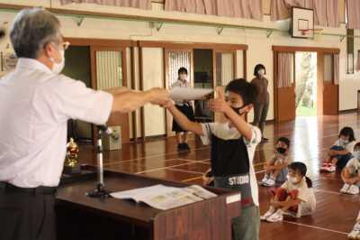 少し緊張していましたが、名前を呼ばれて返事をしたり、教科書を受け取ったりと立派にできました。2年生から6年生までの在校生も歌や言葉で歓迎しました。