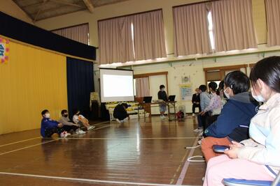 今日は防災教室、保護者への引き渡し訓練をしました。防災教室では、御池少年自然の家の先生に来ていただき、火山が噴火したときの対応や避難の仕方について教えていただきました。その後、避難訓練、保護者引き渡しのため、ヘルメットをかぶって体育館に集合し、保護者に迎えに来ていただきました。毎年、この一連の流れを確認することが大切です。今日は命を守る学習をしました。