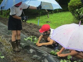 1・2年生は花壇と植木鉢に花の種と野菜の苗を植えました。植木鉢に朝顔、花壇にはピーマンやナス、朝顔の種を植えました。これから毎日、お世話をしながら育てていきます。たくさん花が咲いて、野菜の収穫ができるといいです。