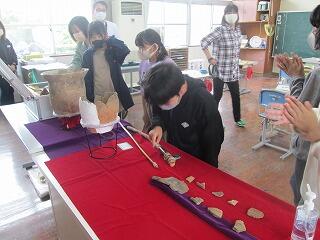 5・6年生の社会で、埋蔵文化センターの先生方に来ていただき学習しました。大昔の人々の生活や都城市の土地のでき方など、映像を見ながら知ることができました。その後は、土器やかけら、狩猟で使っていたおのや矢じりなど、貴重なものに触れることができました。実際に触った土器は、昔の人が作って使っていたと思うとロマンがあります。子どもたちは、とても興味深く触ったり、質問したりしていました。