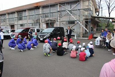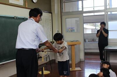 避難後、消防機器の会社の方から火災のこと、消火器の使い方などについてお話を伺いました。児童2名と職員1名が消火器の使用訓練をおこないました。