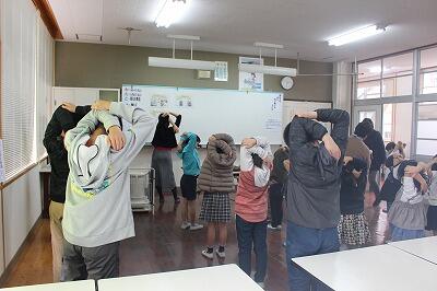 今日は、家庭科室から火災が発生したという設定で避難訓練を行いました。全ての学年が素早く落ち着いて避難することができました。