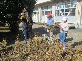 7月に植えた大豆が収穫の時期を迎えました。この日は、1年生から4年生までの13人で作業をします。まず、教頭先生から大豆を引き抜いた後の作業について教えてもらいました。その後作業に入りましたが、楽に見えた穂先の抜き取り作業は、思ったほど簡単ではありませんでした。悪戦苦闘しながら1時間で収穫作業は終わりました。今度は脱穀をして、来年1月には収穫した大豆を使って味噌づくり体験をします。