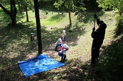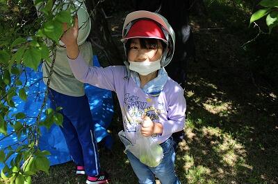 梅が頭に降ってくると危ないので、子どもたちはヘルメットをかぶって作業をしました。梅は堅いので、体に当たると痛いです(*o*)