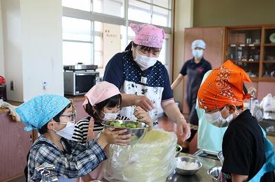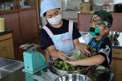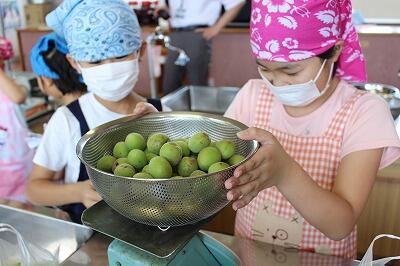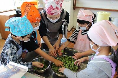 梅収穫の後は、家庭科室で、塩漬けの作業を行います。