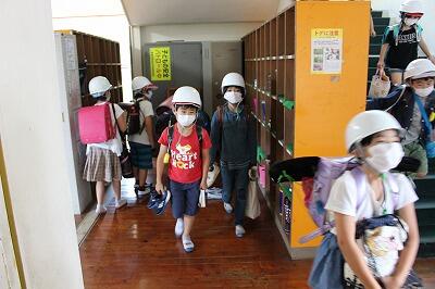 ヘルメットをかぶって、靴を持って体育館に向かいます。