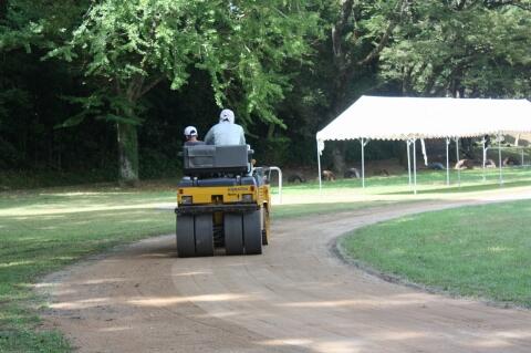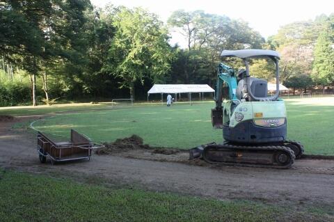 9/4(土)に本校の保護者Aさんがボランティアでグラウンド整備をしてくださいました。夏尾小のグラウンドは、天然芝で覆われていますが、芝が伸びてトラックにはみ出していました。Aさんが事前に基準点を測量し直してくださったおかげで、正規の半円を引くことが可能となりました。今回は、トラックにはみ出た芝と余分な土を、重機で削り、平らに整地した後、ローラーで踏み固めていただきました。