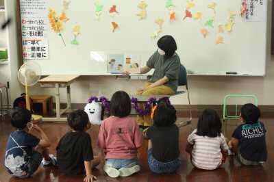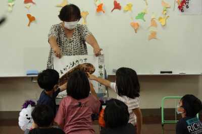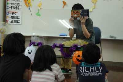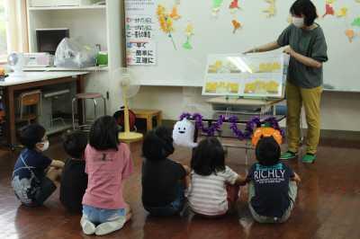 今日、ボランティアのIさんとKさんが来てくださり、1・2年生を対象に本の読み聞かせをしていただきました。コロナ禍で1年半ぶりの実施となったため、1・2年生は今日が初めてです。最初に自己紹介から始めました。ハロウィーンに関する仕掛け絵本、水族館の生き物を実物大で味わえる本、大きな絵本、おじいちゃんとの思い出の心温まる絵本等…面白い本を次から次に紹介してくださり、1・2年生は大喜びでした。45分間があっという間に過ぎて、「つぎのよみきかせがたのしみ~!」と口々に言っていました。ありがとうございました。