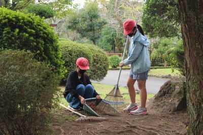 夏尾小学校では、登校した児童が朝のボランティア活動を行っています。今朝は、5年生のKさんと3年生のAさんが落ち葉掃きをしてくれていました。