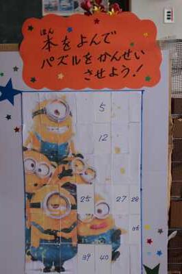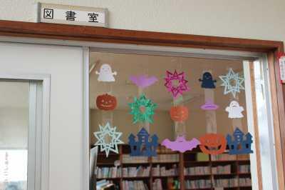本校では、読書の推進に向けて「児童一人当たり年間平均100冊の読書」を目指しています。図書館サポーターの先生が週に1回来られますが、今、読書の秋にちなんで図書室の入口を飾ったり、本を借りたときにくじを引いてパズルのピースを貼ったり・・・といろんな工夫をされています。10/19には、『おたのしみ おはなし会』も企画されています。