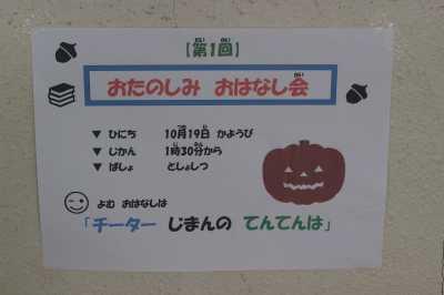 今日は、週に1回の図書館サポーター来校日でした。昼休みに「第1回おたのしみお話会」がありました。『チーターじまんの てんてんは…』という本を読んでいただきました。集まった子どもたちは、読み聞かせが大好きみたいで、聞き入っていました。次回の「おたのしみお話会」は、11月9日(火)の図書館まつりで予定されています。楽しみですね。