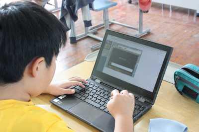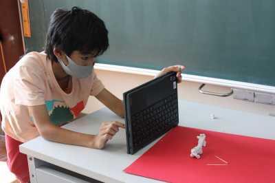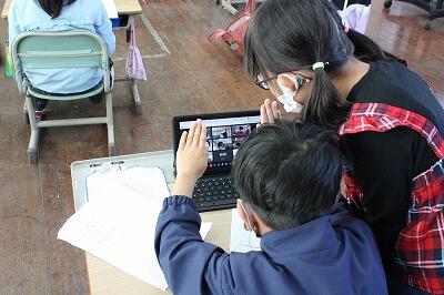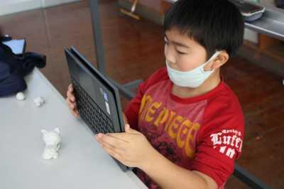 5・6年生の自習時間(図画工作)、粘土で作った作品をタブレットPCで写真撮影していました。作品を画像として記録に残すのだなと思って見ていると、粘土の形や位置を変えてまた撮影。しばらくしてから「見てください。」と児童から言われて、見てみると写真をコマ送りしながら動きのある画像でした。ストーリーもあって、ICTの活用で子どもたちの想像力も広がるのだなと思いました。早く終わった児童は、キーボードの操作を練習していました。