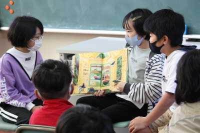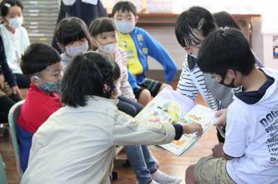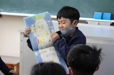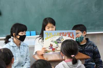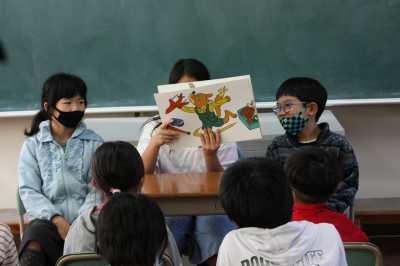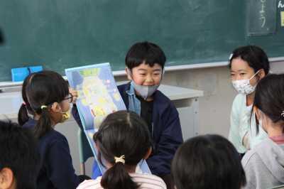 3校時に3・4年生が1・2年生の教室で読み聞かせを行いました。3グループに分かれて絵本や図鑑、紙芝居などを紹介しました。初めての挑戦でしたが、3・4年生は、これまでボランティアの方や図書館サポーターの先生方から読み聞かせしていただいたこともあり、読んでもらった経験を生かして、いろいろと工夫しながら読み聞かせを行いました。聞く側の1・2年生も、読む側の3・4年生も一緒に楽しんでいました。