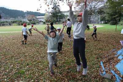 昼休みにグラウンドから子どもたちのにぎやかな声。何をして遊んでいるのかなと思って出てみると、落ち葉で遊んでいました。夏尾小には大きな木がいっぱいあるので、これからの季節、紅葉がきれいです。