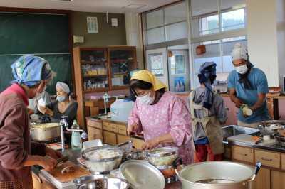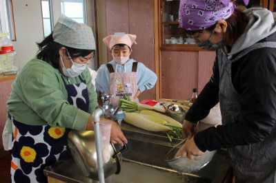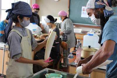 11/12(金)のオープン・スクールで、3~4時間目に全校児童が5つのグループに分かれて体験学習を行いました。料理教室では、学校で収穫したサツマイモを使って「豚汁」と「からいものねったぼ」を作りました。地域の方や保護者の協力を得ながら、美味しい料理ができました。