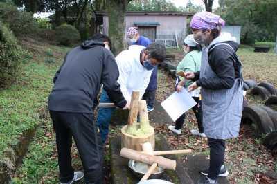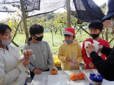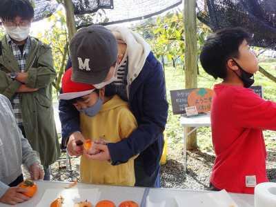 柿狩りは、夏尾地区にある柿園で体験させていただきました。木になっている柿の実を剪定ばさみを使って収穫しました。柿の皮むき体験もさせていただきました。甘くてとても美味しかったです。収穫した柿のいくつかは、交流昼食でもデザートとして使わせていただきました。ありがとうございました。
