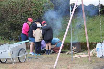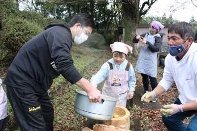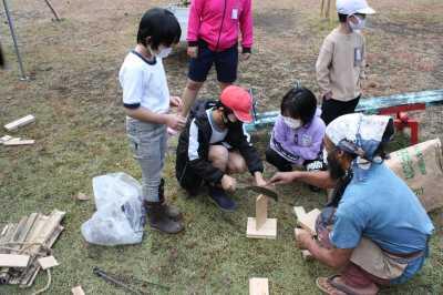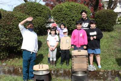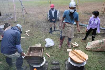 焼き芋は、地域の方に焼いていただきました。蒸かし芋は、自分たちで火を焚いて昔ながらの木のセイロで作りました。薪をナタで割ったり、マッチを擦ったりしました。学校で採れたムカゴを使って、釜でムカゴご飯も炊きました。