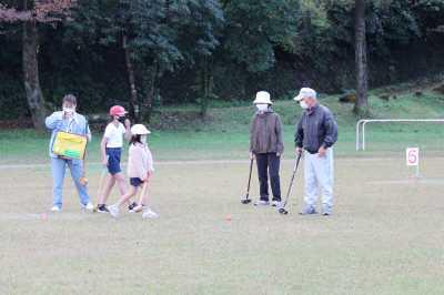 グラウンド・ゴルフでは、地域の方にステッキの持ち方やボールの打ち方のコツを教えていただきました。おかげで、1学期に親子でやった時よりも上手になりました。