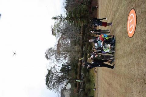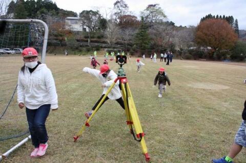 測量体験では、歩幅をもとに距離当てクイズを行ったり、ドローンのカメラ撮影を見たりしました。