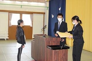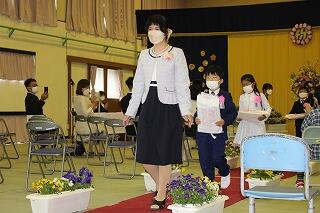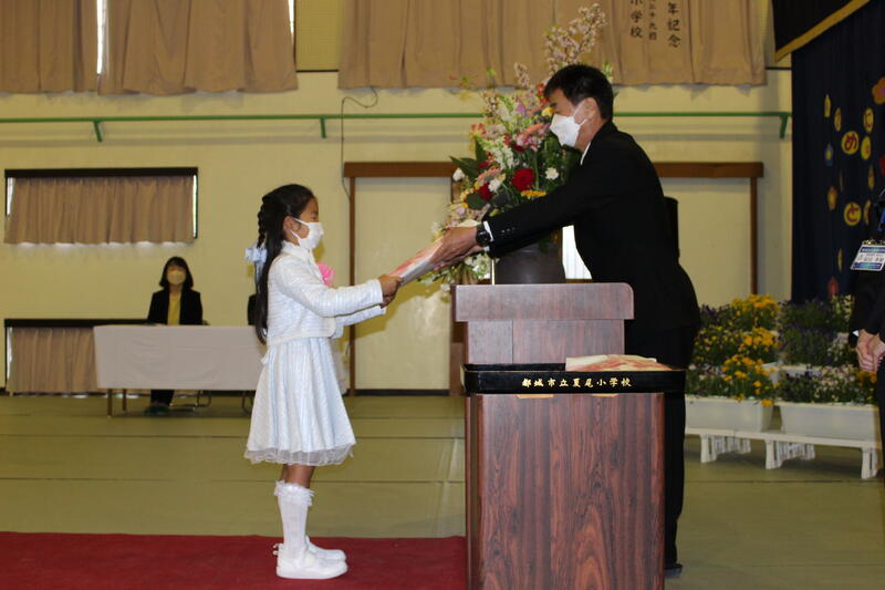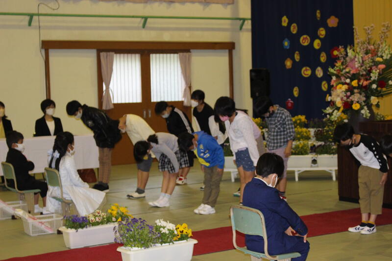 少し緊張していましたが、名前を呼ばれて返事をしたり、教科書を受け取ったりと立派にできました。2年生から6年生までの在校生も歌や言葉で歓迎しました。