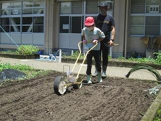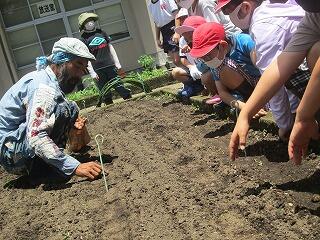 まずは、保護者の先生に大豆についての豆知識を教えていただきました。次に機械を使って、種の間隔を測ります。その後、同じ間隔で種を植えていきました。1年生にとっては、初めての種まきでしたが一人15粒ぐらいをまきました。とても暑い日で、早めに終わった4年生の子どもたちが、低学年のお手伝いをしてあげていました。これから、芽を出し実のるまでお世話をしていきます。最後は、収穫した大豆を使って味噌づくりをします。