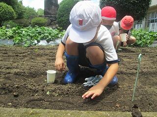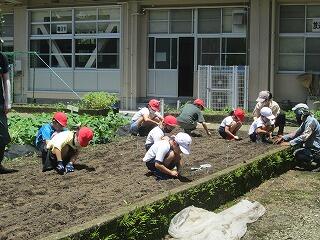 学校の畑に大豆の種をまきました。今回は1年生から4年生までの学年です。