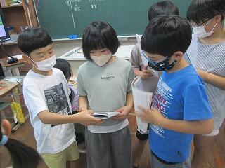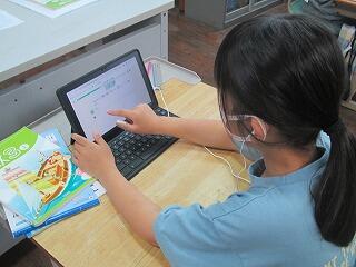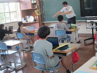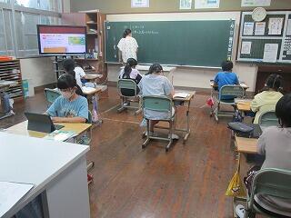 1年生 国語のテスト 2年生 国語の物語読み取り 3・4年生 国語の新聞づくり 5・6年生 パソコンでの学習 でした。どの学級の子どもたちも真剣な表情で、授業に取り組んでいました。3・4年生の教室では、欠席している人のために、パソコンを置いてリモートでの授業を行っていました。
