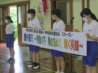 9月に行われる夏尾小中合同運動会に向けて結団式を行いました。中学生が中心となって、スローガンの発表、レクレーション、赤白団決めをしてくれました。8月下旬から運動会練習が始まります。今日は、地域の伝統芸能「奴踊り」の練習を行いました。小学1年生から中学3年生までの子どもたちが全員で踊る様子はちょっと見物です。