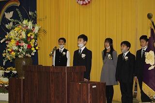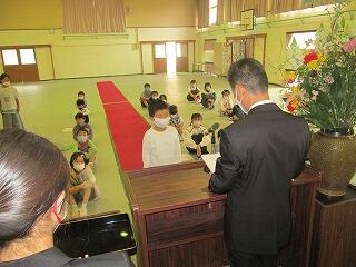 まず、児童2名が今年の成長と次年度に向けて自分の課題を発表しました。その後、学年ごとに代表児童が修了証を受け取りました。子どもたちは、神妙な表情で緊張気味に受け取っていました。