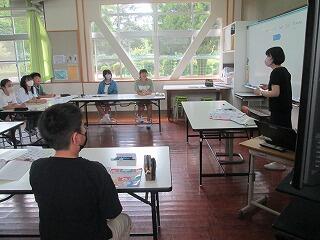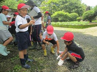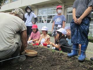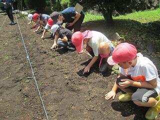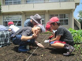 今日は梅雨の中休みという感じで、とてもいい天気になりました。毎年恒例の「大好きなひげ先生」による「みそづくり」の第1弾、「大豆の種まき」をしました。1年生から4年生までの子どもたちの活動です。今日はフランス人のギギ先生も一緒です。まずは、ひげ先生から大豆の植え方や注意することなどを聞きました。その後は、4つの班に分かれて種まきをしていきます。今年初めての1年生は、上級生に教えてもらいながら恐る恐る植えていきます。間隔を開けて一粒一粒植えていく作業は、結構大変でした。明日は雨の予報。恵みの雨となり来週には芽が出るかなと思います。いろいろと教えてくださる「ひげ先生」には、子どもも先生も感謝、感謝です。