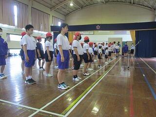 夏尾小中合同運動会に向けて、今日は結団式を行いました。中学生の進行でスローガンの発表や団長・副団長の発表、団色決定をしました。団(チーム)の色を決定するときには、フラフープリレーや伝言ゲームなどをして順番を決めて、最後は風船割りをして赤と白を決めました。それぞれ赤・白が決定したときには大歓声で、これから運動会に向けて頑張るぞという気持ちがあふれていました。ちなみに合同運動会は、9月10日(日)になります。