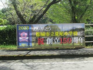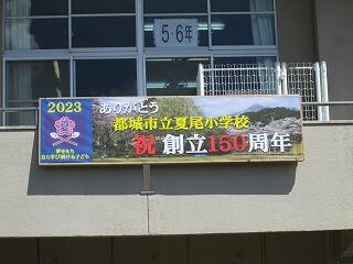 夏尾小学校は、本年度で創立150周年を迎えます。そこで、学校横の道路沿いの歩道に「学校創立150周年」の看板を設置しました。また、学校に入ってすぐの校舎に同じ看板を設置しました。色鮮やかな看板ですので目を引くかなと思います。看板作成をしてくださいました方々、誠にありがとうございました。