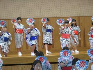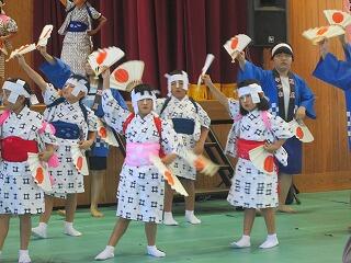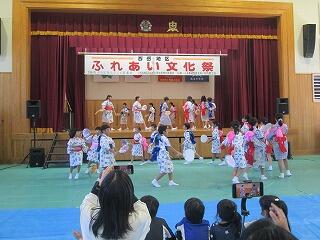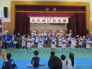 11月3日(金)に西岳地区ふれあい文化祭が行われ、夏尾小学校の子どもたちも参加しました。このお祭りは、西岳・夏尾地区の児童・生徒、地域の方々が出し物をしたり、物品販売や抽選会なども行われたりする楽しい行事です。夏尾小の子どもたちも「サンバヤッサ」と「奴踊り」を披露しました。浴衣姿に薄化粧をして手にはうちわや扇子、のぼり旗、「奴踊り」は三味線の生演奏で踊りました。観に来られた地域の方や保護者の方々にたくさんの拍手をいただきました。