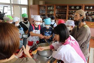 今年度、最後の参観日を行いました。今日は、1月に仕込んだ味噌を使って、5・6年生がみそ汁(豚汁)を作ってくれました。人参、ネギ、さつまいも、玉ねぎを包丁を使って小さく切り、それを大きな鍋でぐつぐつ煮込みます。最後に手作り味噌を入れて完成です。楽しみにしていた1~4年生にふるまいました。