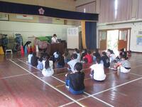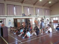体育館での全校集会。バトミントンクラブの子ども達の活躍も紹介されました。