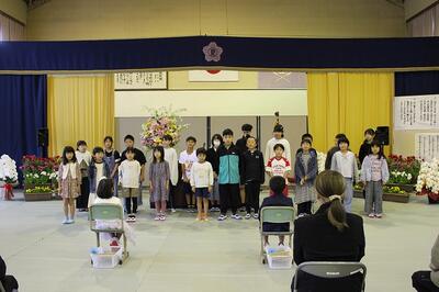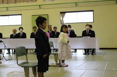 2名のかわいい1年生が入学してきました。在校生が、1年生を迎えるために準備を行い教室も式場もきれいに整いました。 式では、1年生は元気に返事をすることができました。在校生も歌を歌って歓迎しました。かわいい1年生が仲間入りして、より一層、学校が賑やかになります。