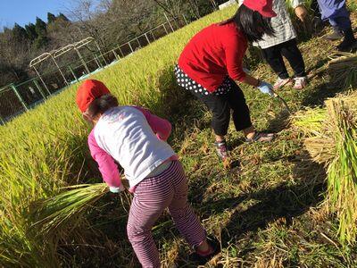 素晴らしい秋空の下、稲刈りが行われました。最初に地域のMさんから代掻きや田の草取りなどこれまでの取組、そして稲を刈るときにけがをしない刈り方についてお話がありました。みんなで稲を干す作業まで行いました。