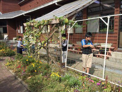 10月29日(水)、8時の気温は10度でした。秋から冬に向かうのを肌で感じることができました。今日は、4年生の3名がヘチマのつるの片付けをしました。