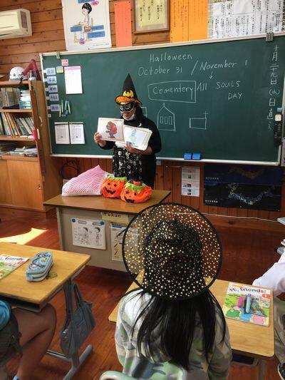 今回の授業はハロウィンをテーマに外国語活動の授業が行われました。衣装を着けて、体を動かして楽しく学習しました。