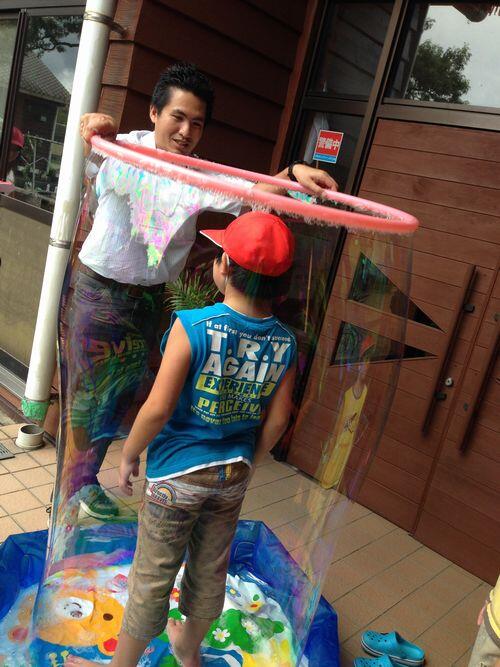 都城高専から講師の先生をお招きして、シャボン玉作りが行われました。大きなシャボン玉の作り方を先生から教わりました。体がすっぽり入るくらいの大きなシャボン玉を作ることができました。
