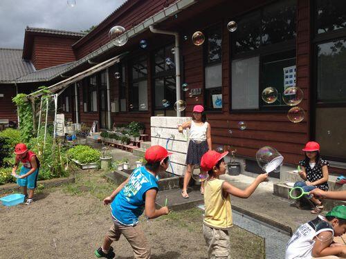 都城高専から講師の先生をお招きして、シャボン玉作りが行われました。大きなシャボン玉の作り方を先生から教わりました。体がすっぽり入るくらいの大きなシャボン玉を作ることができました。