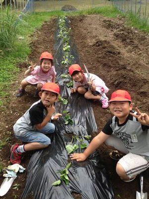 1年生が生活科の時間に学校の畑を耕して、いも植えを行いました。「おいもが大きく大きく育ちますように」、「甘い甘いおいもがとれますように」と願いながら一生懸命草取りをしました。草取りが終わって、みんなでうねを作っておいもを植えました。
