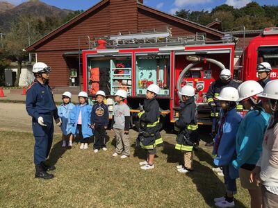 都城消防署から4名の隊員の方をお招きして、火災時の避難訓練について学習しました。火事の恐ろしさや消化器の使い方について教えてくださいました。